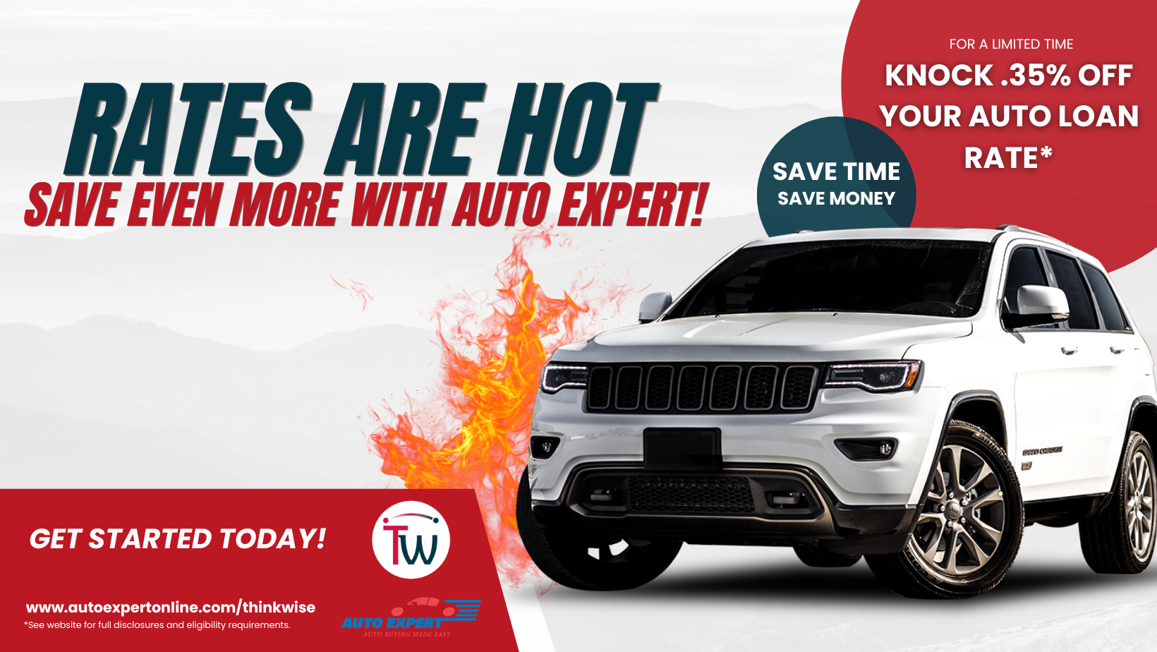Vehicle must be purchased through Auto Expert to qualify for the rate discount. Offer valid April 1, 2026 - September 30th, 2026. Rate discount available for a limited time on qualifying auto loans only. Rate and approval subject to creditworthiness and underwriting guidelines. Additional terms and conditions may apply. Contact us for full details.
